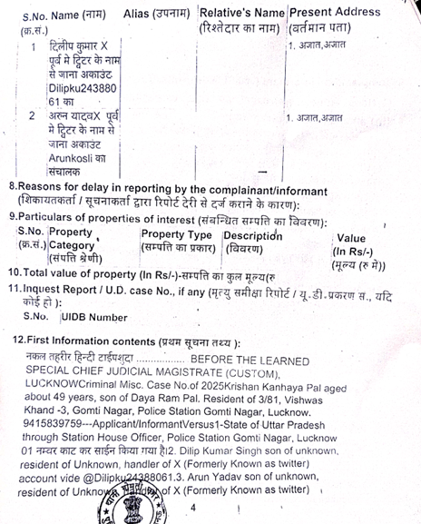 उक्त मामले में सबसे पहले समाजवादी अधिवक्ता सभा के राष्ट्रीय अध्यक्ष कृष्ण कन्हैया पाल ने थाना गोमती नगर, लखनऊ में आवेदन दिया। वहाँ कोई कार्रवाई न होने पर पुलिस आयुक्त, लखनऊ को प्रार्थना पत्र प्रस्तुत किया। फिर भी न्याय न मिलने पर अंततः माननीय विशेष मुख्य न्यायिक मजिस्ट्रेट (कस्टम), लखनऊ की शरण ली।